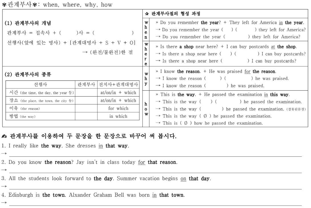 끝으로 관계부사절을 설명한다. 관계부사절은 관계대명사절과 마찬가지로 형용사 절이지만 관계대명사절과 구분되는 뚜렷한 특징이 있다. 바로 명사를 대신하는 것이 아니라 부사를 대신한다는 이유로서 발생하는 특징인 관계부사 이후의 문장이 완벽하다는 점이다. 이 또한 학생들이 무지성으로 외우도록 하는것이 아닌 관계대명사절을 만들어보는 과정을 차근히 따져보았던 과정을 여기서도 적용할 수 있도록 지도하면 이해가 되기 때문에 짧은 시간 더 길게 학습한 지식이 오랫동안 남아있을 수 있다.